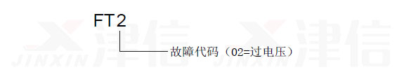 當偉肯變頻器出現(xiàn)故障時,偉肯變頻器會停止運轉(zhuǎn),并且在顯示器上以如下的格式閃爍顯示符號FT 和故障代碼。例如: