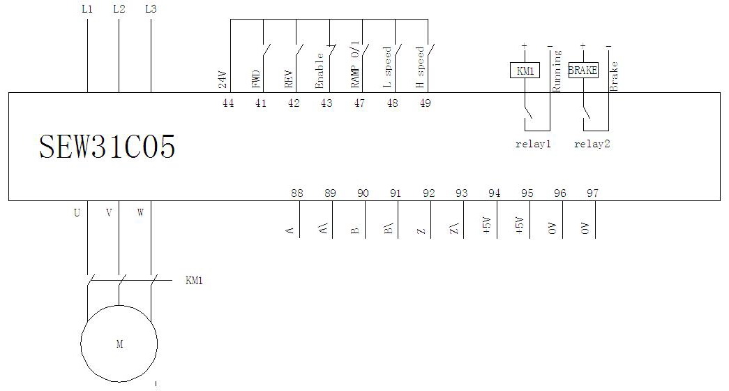 堆垛機(jī)是整個(gè)自動(dòng)化立體倉庫的核心設(shè)備,通過手動(dòng)操作、半自動(dòng)操作或全自動(dòng)操作實(shí)現(xiàn)把貨物從一處搬運(yùn)到另一處。它由機(jī)架(上橫梁、下橫梁、立柱)、水平行走機(jī)構(gòu)、提升機(jī)構(gòu)、載貨臺(tái)、貨叉及電氣控制系統(tǒng)構(gòu)成。其原有的提升機(jī)構(gòu)是通過SEW變頻器驅(qū)動(dòng)的,由于SEW變頻器損壞,無法修復(fù),客戶急需生產(chǎn),所以用丹佛斯FC302系列變頻器進(jìn)行替代。