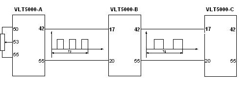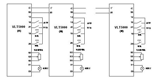 系統(tǒng)由5臺(tái)VLT5000系列變頻器及輔助的開關(guān)、指示燈、電位器及必要的空開等電氣器件組成。圖-1中A變頻器的速度作為主速給定(它自身的速度由外部電位器給定), A變頻器的42號(hào)端子對(duì)應(yīng)自身輸出轉(zhuǎn)速,自動(dòng)的轉(zhuǎn)化為脈沖信號(hào)(頻率)輸出給B變頻器,作為B變頻器的速度給定信號(hào)(通過B變頻器的29號(hào)端子來接收脈沖信號(hào)),然后再由B變頻器通過修改內(nèi)部參數(shù)327號(hào),經(jīng)過計(jì)算后相應(yīng)的輸出一定的轉(zhuǎn)速。同理B變頻器對(duì)應(yīng)自身輸出轉(zhuǎn)速自動(dòng)的轉(zhuǎn)化為脈沖信號(hào)(頻率)通過42號(hào)端子輸出脈沖信號(hào)(頻率)作為C變頻器的速度給定信號(hào)(通過C變頻器的29號(hào)端子來接收脈沖信號(hào)),以此類推,一直到E變頻器。在此過程中,所有速度給定信號(hào)都是數(shù)字式的(既速度信號(hào)通過給定的脈沖頻率的變化,結(jié)合自身內(nèi)部的計(jì)算實(shí)現(xiàn)不同的轉(zhuǎn)速)。