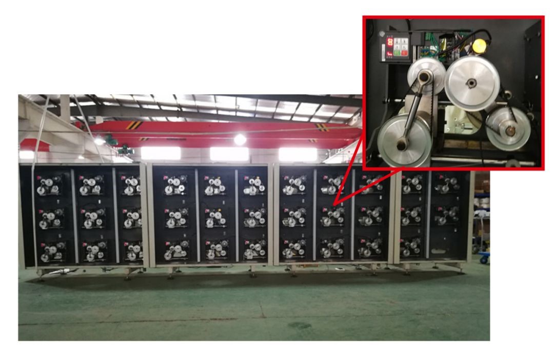 老式金拉線分切機(jī)分切速度慢 ,分切后的成品收卷用同一臺(tái)電機(jī)實(shí)現(xiàn),1個(gè)電機(jī)帶動(dòng)60個(gè)卷軸進(jìn)行收卷,具有如下幾大缺點(diǎn):