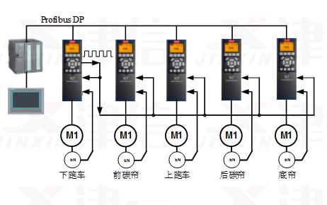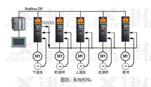 驅(qū)動系統(tǒng)的整體結(jié)構(gòu)如圖四,每根軸獨(dú)立按自己的電子凸輪曲線運(yùn)行,屬于典型的分布式控制系統(tǒng),對主控制器的性能要求,一般的PLC就能勝任。由于每根軸都與主軸保持電子凸輪同步關(guān)系,所以總體上可以實(shí)現(xiàn)多軸同步的控制需求。其中下跑車運(yùn)動控制器比較特殊,他具有虛擬主軸脈沖輸出的功能,代替主控制器發(fā)送主軸脈沖信號。