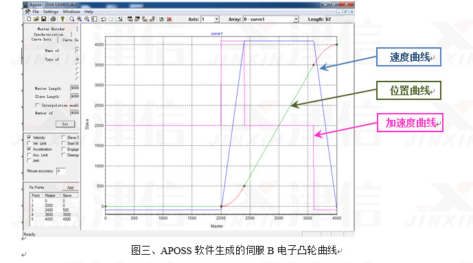 丹佛斯MCO305的開發(fā)軟件為APOSS,內(nèi)置電子凸輪曲線生產(chǎn)功能,加上述計(jì)算得到的a、b、c、d、e 五點(diǎn)電子凸輪曲線特征點(diǎn)按軟件要求填入表格,就能自動生成如圖三所示的電子凸輪曲線。